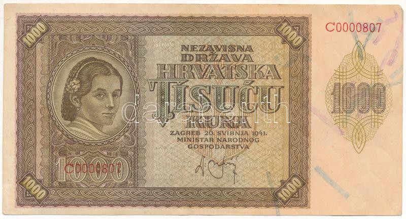 Description: Horvátország / Független Horvát Állam 1941. 1000K alacsony "C0000807" sorszámmal T:F szép papír
