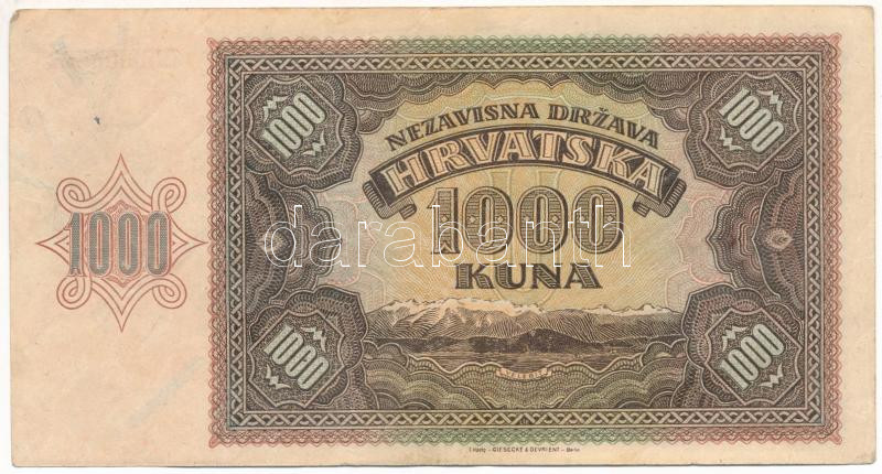 Horvátország / Független Horvát Állam 1941. 1000K alacsony "C0000... https://www.darabanth.com/en/469-Online-auction/469.0/Numismatics/Worldwide-banknotes~2000015/Horvatorszag-Fuggetlen-Horvat-Allam-1941-1000K-alacsony-C0000807-sorszammal-TF-szep-pap~II3132161