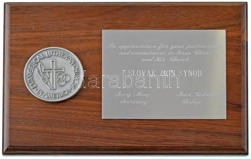 Description: Amerikai Egyesült Államok ~1980. "Evangélikus Luteránus Egyház Amerikában" ezüstözött fém emlékérem (62mm) fatáblán (177x255mm), elismerő fém táblával (127x101mm) T:AU USA 1988. "Evangelical Lutheran Church in America" silver plated metal commemorative medallion (62mm) on wooden table (177x255mm), with appreciative metal table (127x101mm) C:AU
