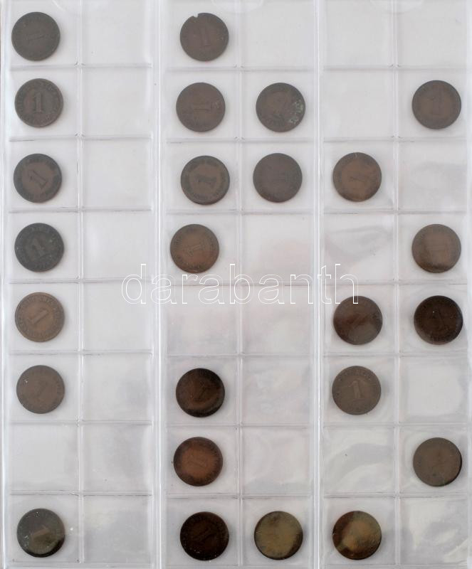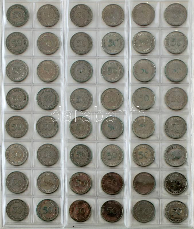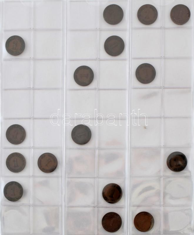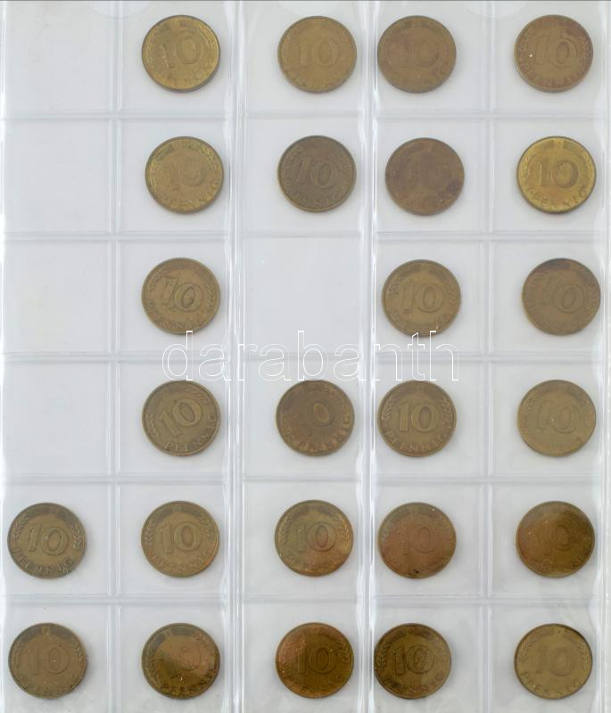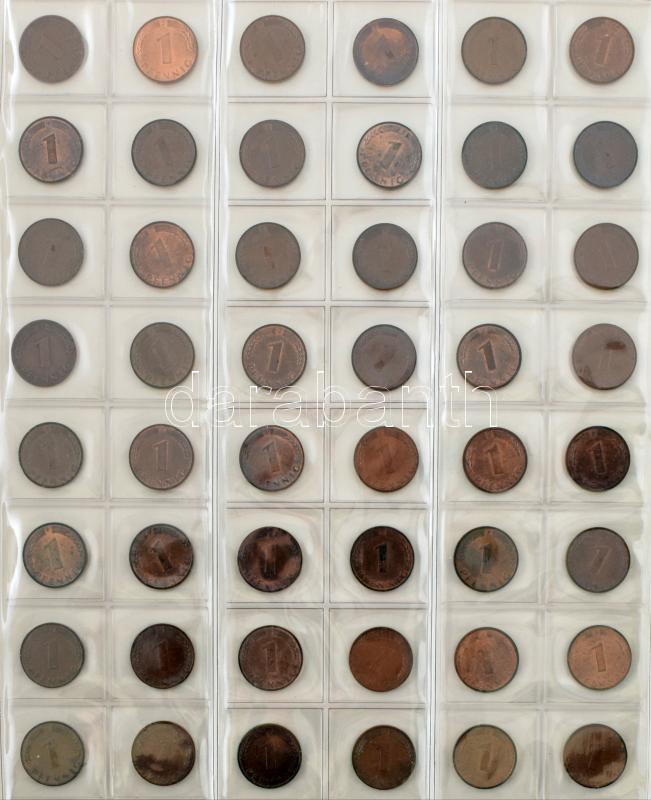 Németország 1874-1996. Tartalmas, mintegy ~1100db-os német érmegyűjtemény összesen négy berakóalbumba rendezve, a Német Birodalom, a Harmadik Birodalom és az NSZK pénzrendszerén át az újraegyesült Németországig. Benne ritkább évjáratú és verdejelű érmékkel, pl. 1904J 2pf bronz + 1923J 2pf bronz + 1904F 5pf Cu-Ni + 1936A 2pf bronz + 1936G 5pf Al-bronz + 1936A 10pf Al-bronz + 1987. 50pf Cu-Ni (2xklf: D és F verdejel) + 1968. 1M Cu-Ni (4xklf: D, F, G, J verdejelek) T:vegyes Germany 1874-1996. A big collection with ~1100 coins arranged in four inlay holders, through the monetary system of the German Empire, the Third Reich and the FRG up to the reunified Germany. It contains rarer year and mintmark coins, like 1904J 2 Pfennig bronze + 1923J 2 Rentenpfennig bronze + 1904F 5 Pfennig Cu-Ni + 1936A 2 Reichspfennig bronze + 1936G 5 Reichspfennig Al-bronze + 1936A 10 Reichspfennig Al-bronze + 1987. 50 Pfennig Cu-Ni (2xdiff: D and F mintmarks) + 1968. 1M Cu- Ni (4xdiff: D, F, G, J mintmarks) C:mixed