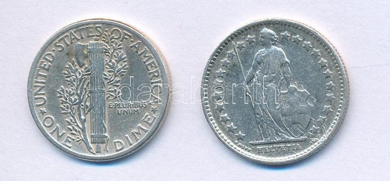 Description: Vegyes: Amerikai Egyesült Államok 1943. 1d (10c) Ag "Mercury" + Svájc 1920. 1/2Fr Ag T:XF,VF Mixed: USA 1943. 1 Dime (10 Cents) Ag "Mercury" + Switzerland 1920. 1/2 Franc Ag C:XF,VF