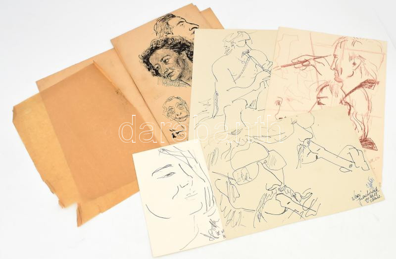 Olvashatatlan jelzéssel vagy jelzés nélkül: 9 db portré vázlatrajz. Klf. technikák, papír, 30x21 cm körüli méretekben.