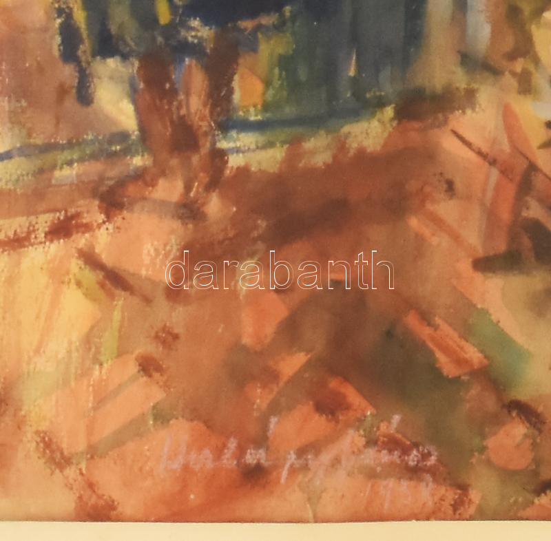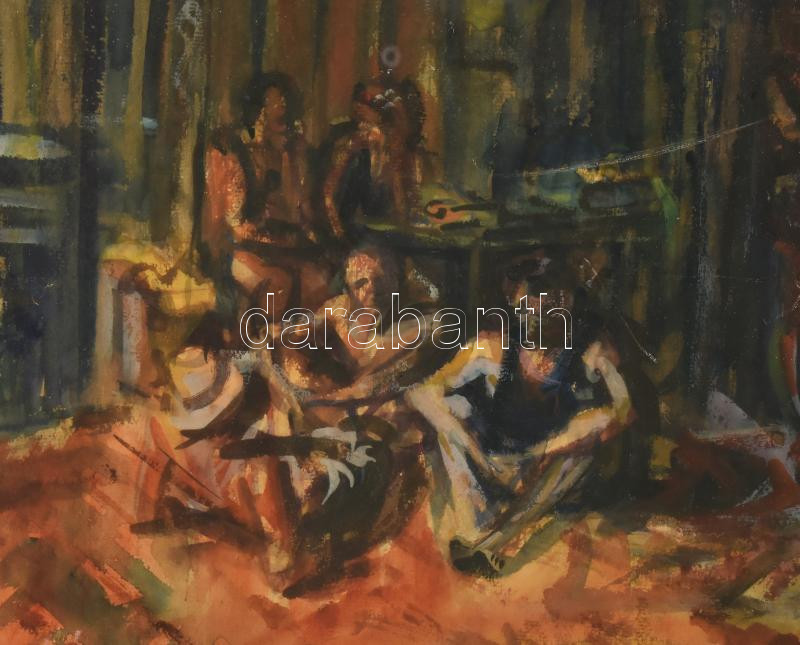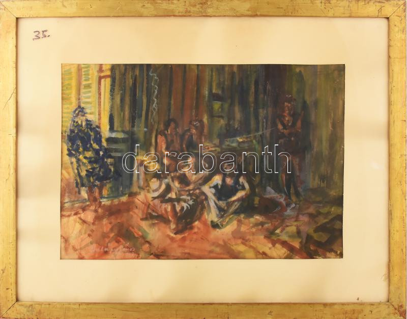 Halápy János (1893-1960): Füredi uszodában, 1938. Akvarell, pasztell, papír, jelezve balra lent. Hátoldalán Halápy János autográf feliratával és Nemzeti Szalon kissé töredékes raglapjaival. Kiállítva: XC (90.) csoportkiállítás, Nemzeti Szalon, Bp., 1939 május, katalógus 102. v. 108. tétel (mindkettő címe: Füredi uszodában). 33,5x48 cm. Üvegezett fakeretben. / watercolour and pastell on paper, signed lower left, exhibited in 1939, framed.