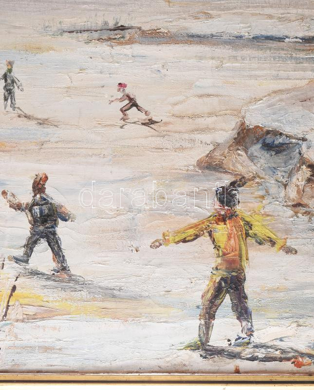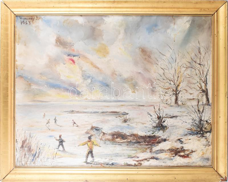 Hunyady István (1939 - ): Balaton télen, Olaj, vászon, jelzett, sérült keretben 60x80 cm