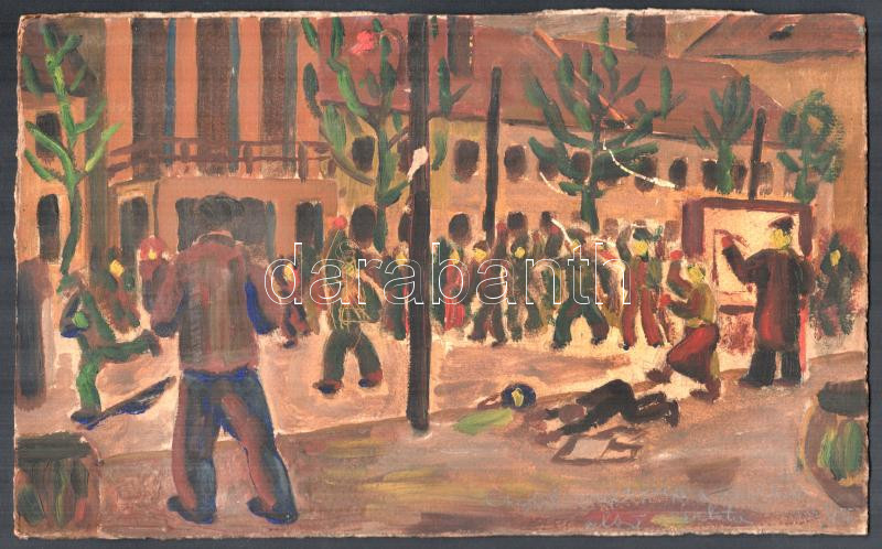 Description: Nolipa István Pál (1907-1986): Csepel (vázlat), 1945. Olaj, karton. Jelzés nélkül, jobbra lent autográf felirattal. Apró felületi sérülésekkel. Hátoldalán vázlat. 22x35 cm