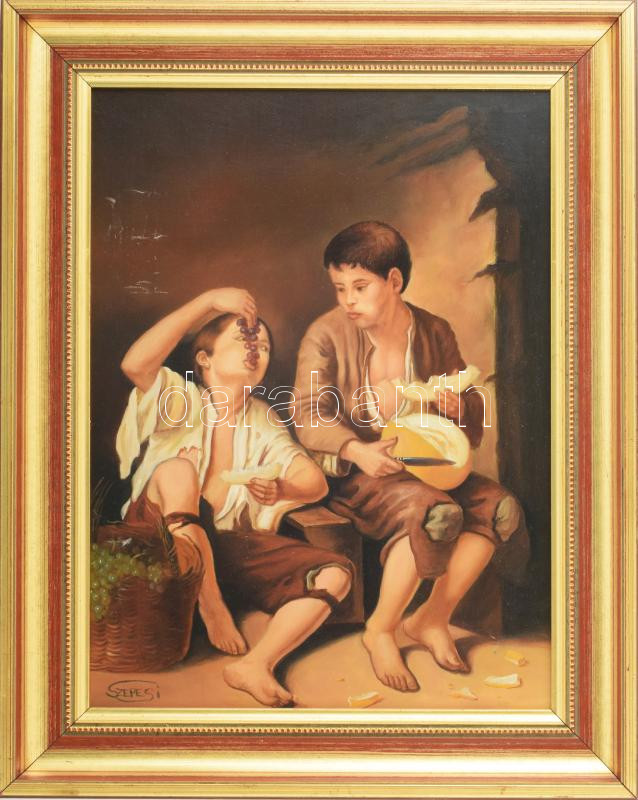 Szepesi Andor (1954-): Gyümölcsevők. Olaj, farost. Jelezve balra lent. 40x30 cm. Apró felületi sérülésekkel. Dekoratív fakeretben.
