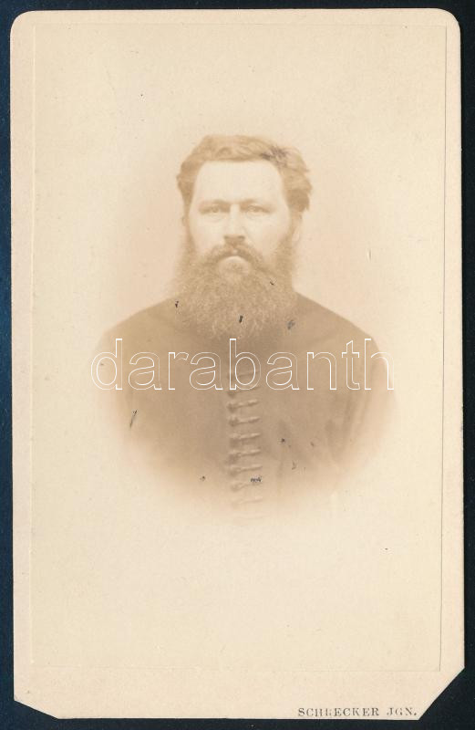 Description: 1865 Révész Imre (1826-1881) református lelkész, egyházjogi és egyháztörténeti kutató és író, a református közvetítő teológia atyja, a debreceni újortodoxia elindítója; vizitkártya Schrecker Ignác (1834-1888) pesti műterméből, alsó sarkai vágottak, 9,5x6 cm
