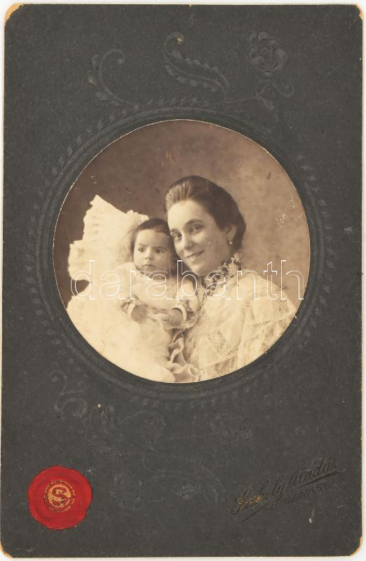 1913 Rónai Mihályné és Rónai Mihály András, dombornyomott kartonra kasírozott fotó Székely Aladár műterméből, 16,5×10,5 cm