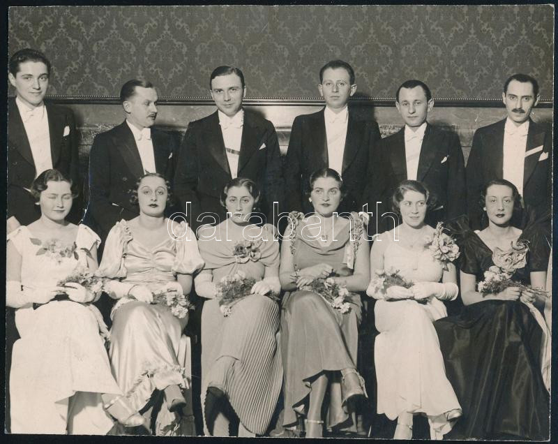 1936.II.1. Bp., "Charité Bál", elegáns hölgyek és urak csoportképe, a hátoldalon pecséttel jelzett (Schäffer fotó), 16,5x13 cm