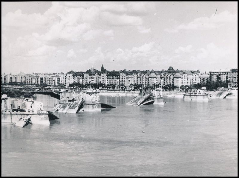 1945 Szendrő István (1908-2000): Budapest, a szétlőtt Margit híd, pecséttel jelzett fotó, 16,5×21,5 cm