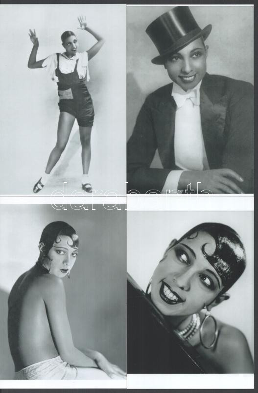 Description: Josephine Baker (1906-1975) francia énekesnő, táncosnő, előadóművész, eltérő időben készült felvételek (cca 1930 előtt), 4 db modern nagyítás, jelzés nélkül, 15x10 cm