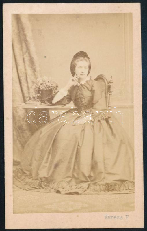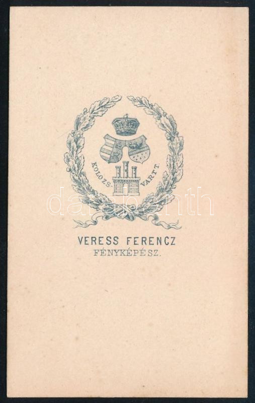 cca 1855-60 Fiatal, előkelő, hölgy portréja, az asztalon egy egy vadászkutya szoborral, keményhátú fotó Veress Ferenc kolozsvári műterméből, érdekes magyar-erdélyi címeres hátlappal, korai erdélyi cdv, jó állapotban, 10,5x6 cm