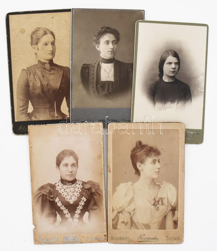 cca 1885-1910 Fiatal hölgyek, 5 db vizitkártya, klf. műtermekből (Hunnia, Schmidt Ede, Kozmata Ferenc, stb.), változó állapotban, 10,5x6,5 cm körül