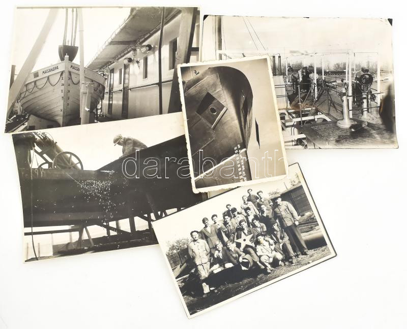 Description: cca 1946-1960 Ganz és Társa R.T. hajógyári felvételek, munkások csoportképe, stb., össz. 5 db fotó, részben pecséttel jelzettek, 11,5x8 cm és 17,5x12,5 cm között