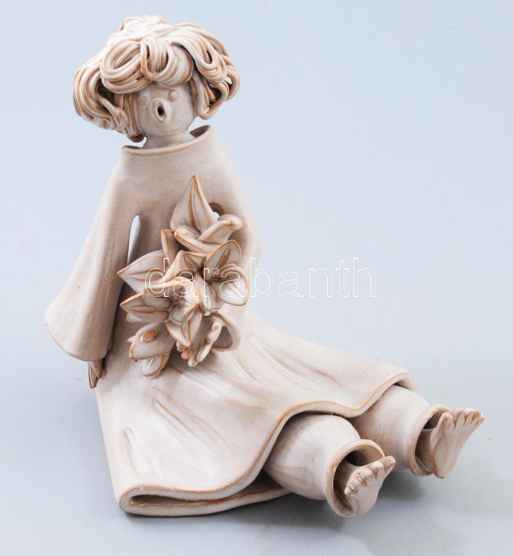 Buday Ágota éneklő kislány csokorral, festett kerámia figura, jelzett,...
