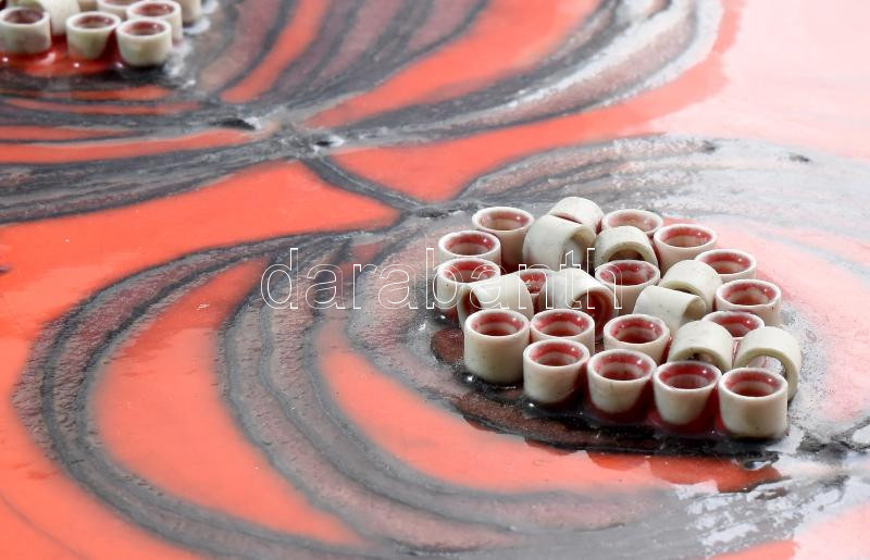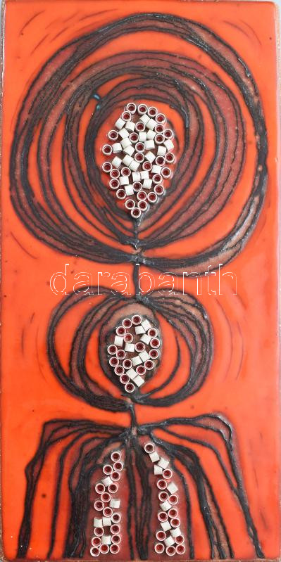 Description: Janáky Viktor (1933-1999): Modernista figurális plakettkép. 1976. Többmázas kerámialap, felületbe mázazott porcelán gyűrűszigetekkel. Hátoldalon jelzett: Janáky. A művész autográf ajándékozási szövegével. Egyik gyűrűn kis hiány. 44x22 cm