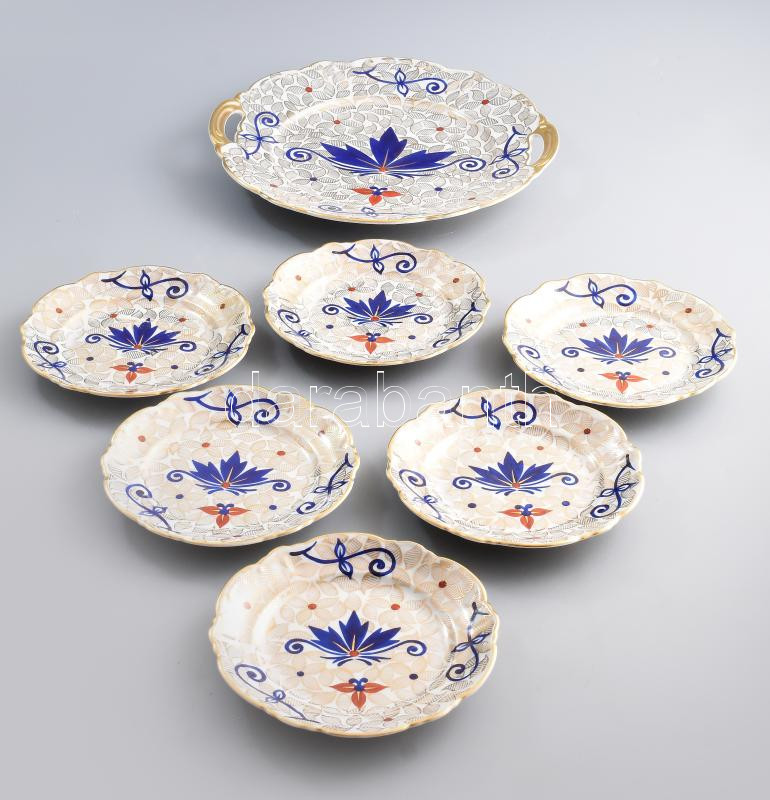 K.M.K. porcelán süteményes készlet hat személyes. Kézzel festett, aranyozott, jelzett, minimális kopással d: 26 cm, 15 cm