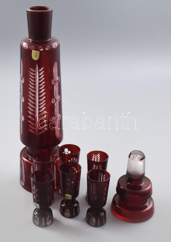 Csiszolt bordó röviditalos készlet, teljes, hibátlan, m: 36 cm, poharak m: 8 cm