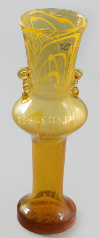 Sárga üveg váza nagy méretű cseh, formába fújt, anyagában színezett, szállal, hibátlan, jelzett. 37 cm
