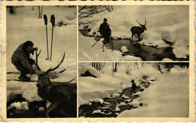 1941 Volóc, Volovec, Volovets; Sí- és vadászterepek a Borzsovai-havasokon, síelő szarvassal, téli sport. Hangya szövetkezet kiadása. Foto Manduk / ski and hunting fields, winter sport, skier with deer (kis szakadás / small tear)