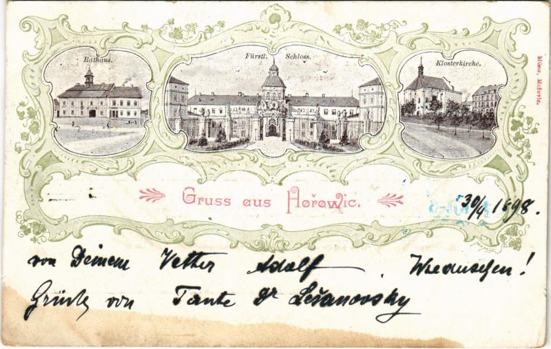 1898 (Vorläufer) Horovice, Horowitz; Rathaus, Fürstl. Schloss, Klosterkirche / town hall, castle, church. Art Nouveau, floral (fl)