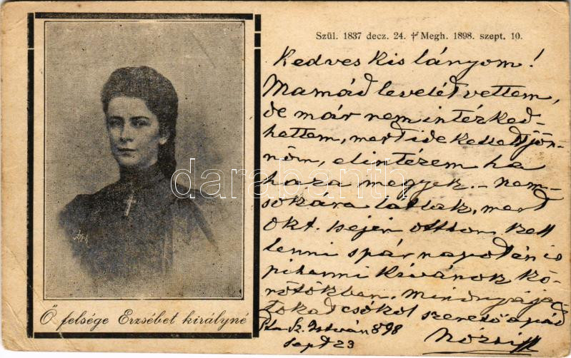 1898 (Vorläufer) Ő felsége Erzsébet királyné (Sissi): szül. 1837. dec.... https://www.darabanth.com/en/469-Online-auction/469.0/Postcards/Emperors-Politicians-Royal-families~1500053/1898-Vorlaufer-O-felsege-Erzsebet-kiralyne-Sissi-szul-1837-dec-24-megh-1898-szep~II3172155
