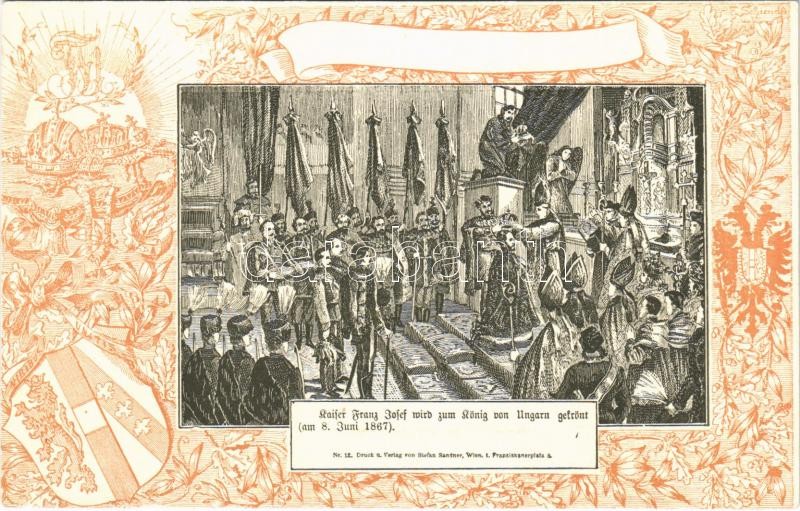 Kaiser Franz Josef wird zum König von Ungarn gekrönt (am 8. Juni 1867) / The Coronation of Franz Joseph I of Austria as King of Hungary. Viribus Unitis. Art Nouveau, floral frame with coat of arms. litho s: E. Schiendl