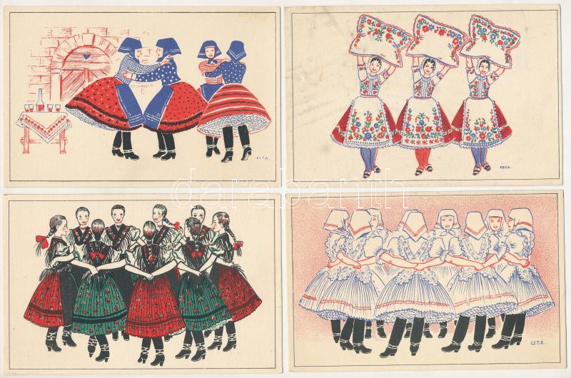4 db modern magyar Művészeti Alkotások kiadású folklór képeslap: Cigánd, Domoszló, Mikóháza, Öregcsertő