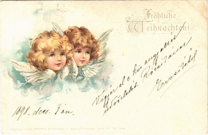 1898 Fröhliche Weihnachten / Christmas greeting art postcard with angels. Theo. Stroefer's Kunstverlag. Aquarell-Postkarte Serie VI. No. 5419. (fl)