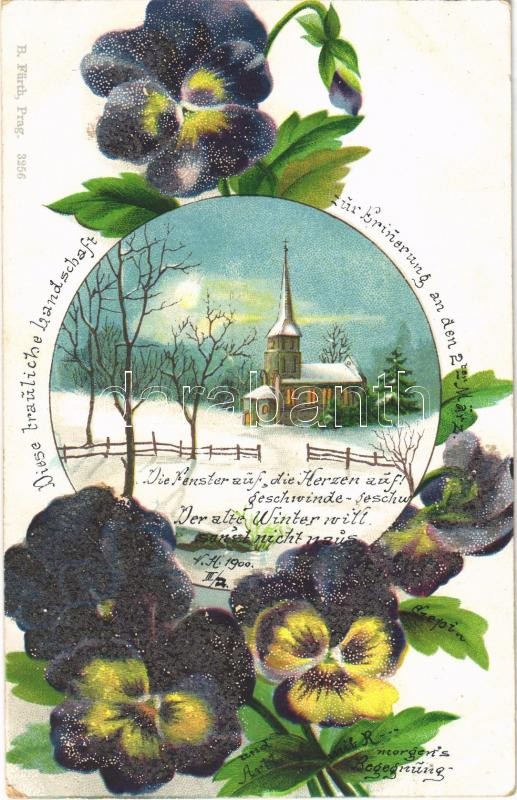 1900 Art Nouveau, floral greeting art postcard with winter landscape. B. Fürth 3256. litho (EK)