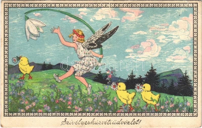 1919 Szívélyes húsvéti üdvözlet! / Easter greeting art postcard, fairy...