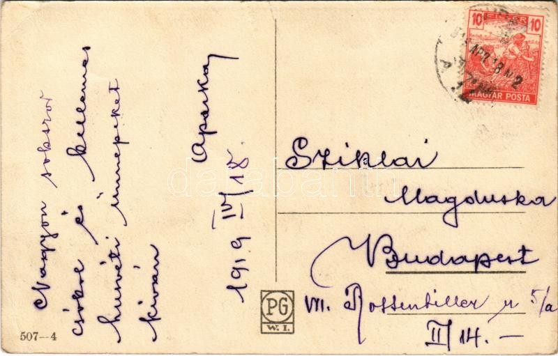 1919 Szívélyes húsvéti üdvözlet! / Easter greeting art postcard, fairy with chicken. P.G.W.I. 507-4. (EK)
