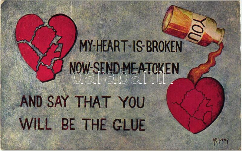 My heart is broken now send me a token, and say that you will be the glue / Love greeting card s: R. E. Avery (EK)