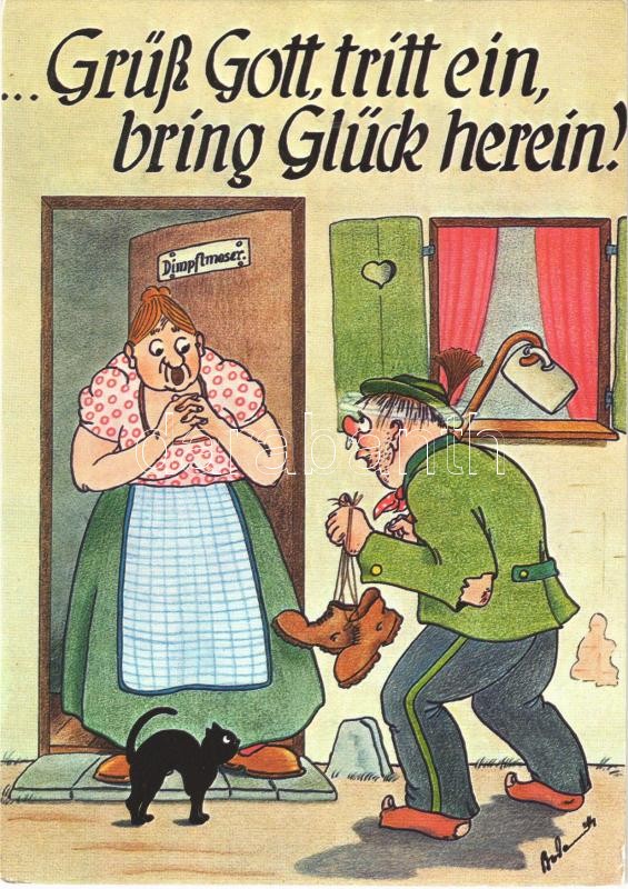Grüß Gott, tritt ein, bring Glück herein! / marriage humour art postcard (EK)