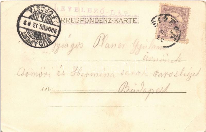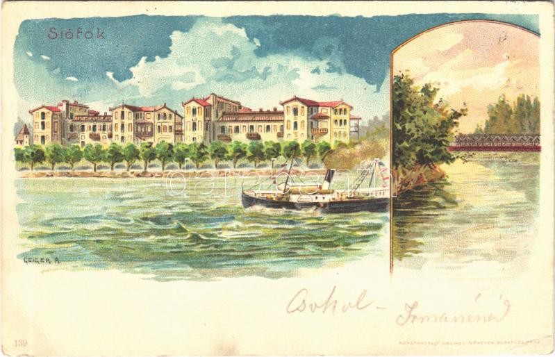 1900 Siófok, Hullám és Sió szállodák. vasúti híd a Sión. Kunstanstalt Kosmos 139. litho s: Geiger (EB)