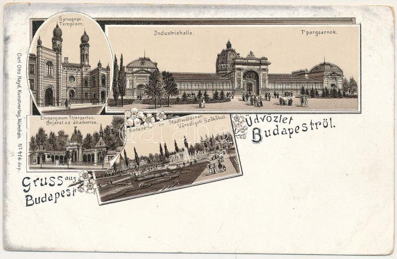 Budapest, Iparcsarnok, Dohány utcai zsinagóga, bejárat az állatkertbe, városligeti szökőkút. Carl Otto Hayd No. 416. Art Nouveau, floral, litho