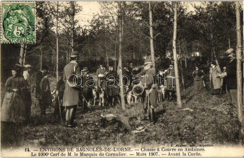 Description: 'Environs de Bagnoles-de-l'Orne - Chasse á Courre en Andaines Le 1000e Cerf de M. le Marquis de Cornulier - Mars 1907 - Avant la Curée' / Bagnoles-de-l'Orne area, hunting with dogs, de Cornulier Marquis' thousandth stag, in March 1907 (EK)