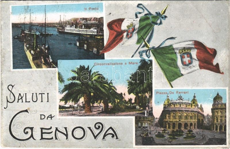 Description: 1917 Genova, Genoa; Saluti da Genova. Il Porto, Circonvallazione a Mare, Piazza de Ferrari / port, steamship, street view, square, tram, Italian flags (EK)