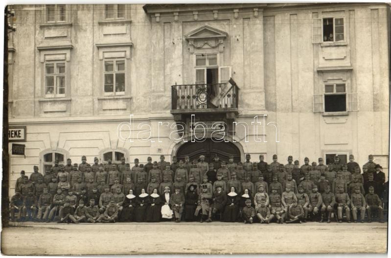 Description: Filiale Ebreichsdorf des K.u.K. Reserve Spital No. 11. Invalidenschule: Landwirtschaftliche Abtheilung / WWI Austro-Hungarian military hospital, group photo with soldiers, doctors and nurses