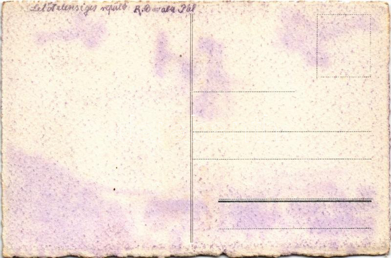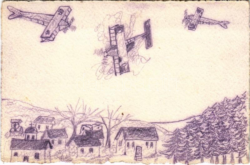 Description: Lelőtt ellenséges repülő. Első világháborús osztrák-magyar katonai saját kézzel rajzolt lap / WWI K.u.k. Austro-Hungarian military hand-drawn postcard s: R. Dovala Pál (fl)