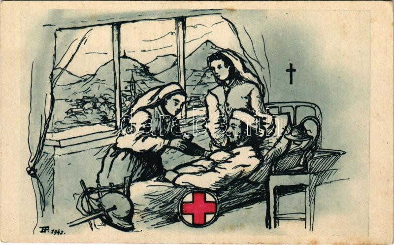 Második világháborús magyar katonai lap, sérült katona és nővérek - Sá...