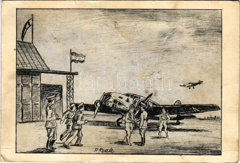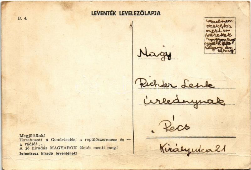 Description: Megjöttünk! Hazahozott a Gondviselés, a repülőszerencse és a rádió!... A jó híradás Magyarok életét menti meg! Jelentkezz híradó leventének! Leventék levelezőlapja B. 4. s: P. Bak (?) (lyuk / pinhole)