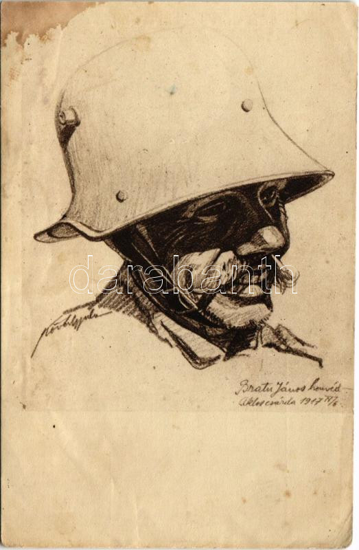 Description: Tanulmányfej. Bratu János. Kiadja a m. kir. 10. honvéd gyalogezred az özvegy- és árvaalap javára. Herbst műnyomása / WWI Austro-Hungarian K.u.K. military art postcard s: Kövér Gyula hadnagy (ázott / wet damage)