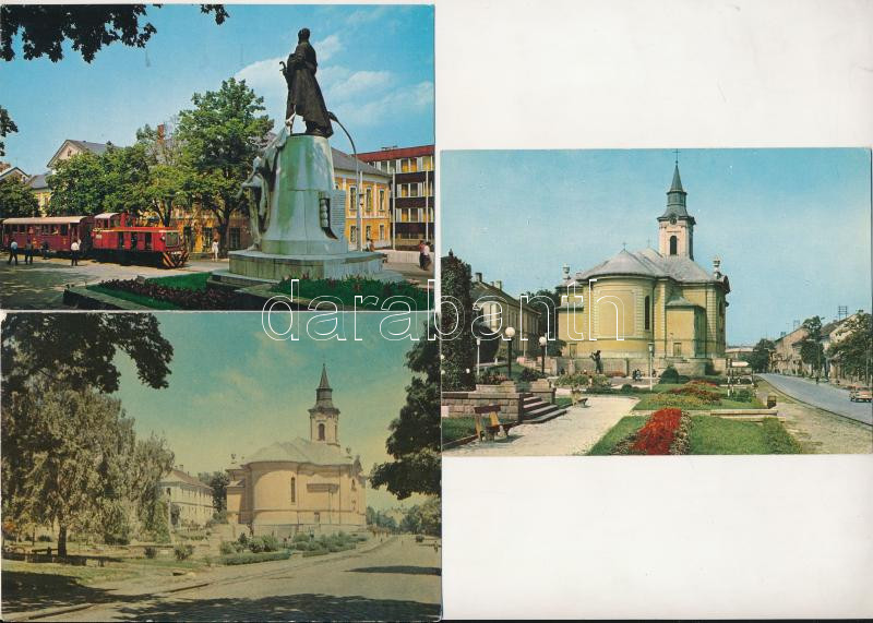 Description: Sátoraljaújhely - 3 db MODERN képeslap (MÁV Hegyközi kisvasút vonala, vonat a Kossuth Lajos szobornál, Szabadság tér, Hősök tere, Bodrogközi Gazdasági Vasút BKGV)