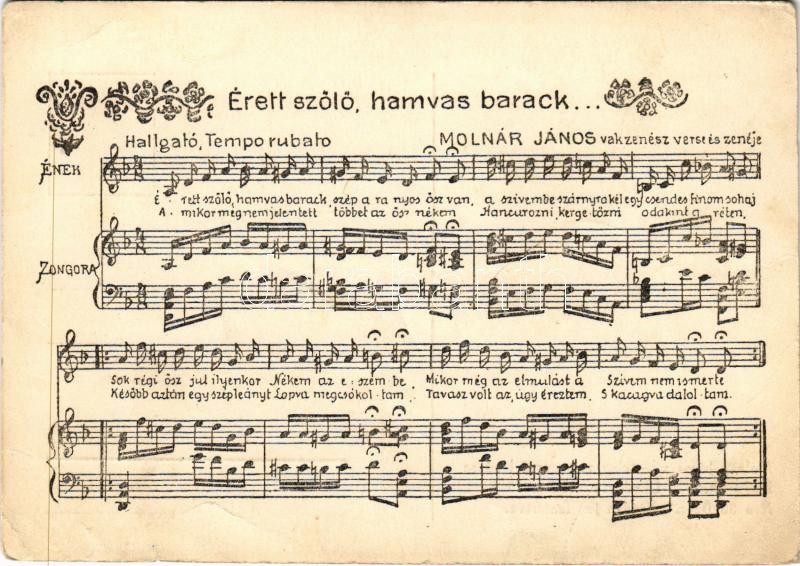 Érett szőlő, hamvas barack... Molnár János vak zenész verse és zenéje.... https://www.darabanth.com/en/469-Online-auction/469.0/Postcards/Music-Musicians~1500068/Erett-szolo-hamvas-barack-Molnar-Janos-vak-zenesz-verse-es-zeneje-Molnar-Janos-vilag~II2414696