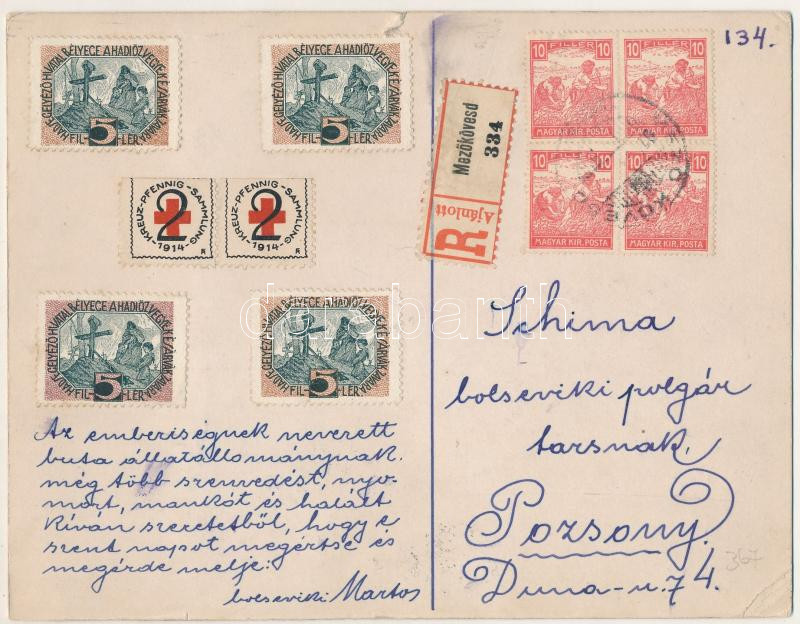 1917 PAX Karácsony - Schima András Bandi (1882-1959) győri iparművésznek (bolseviki polgártárs) címzett levél Martos Ferenctől Mezőkövesdről / Hungarian hand drawn propaganda art (14 x 18 cm)