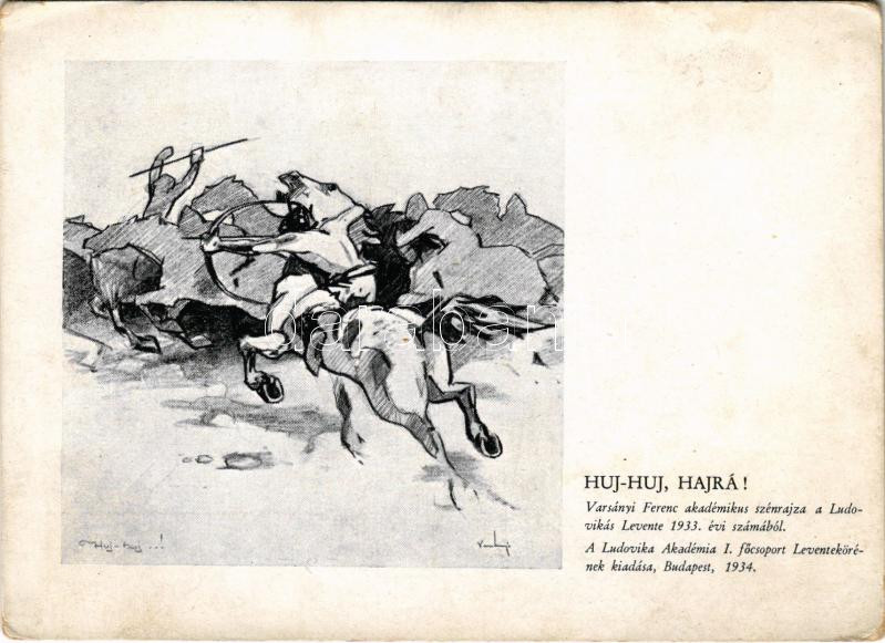 Description: Huj-huj, hajrá!. Varsányi Ferenc akadémikus szénrajza a Ludovikás Levente 1933. évi számából. Kiadja Ludovika Akadémia I. főcsoport Leventeköre / Hungarian military art postcard, propaganda s: Varsányi Ferenc (EB)