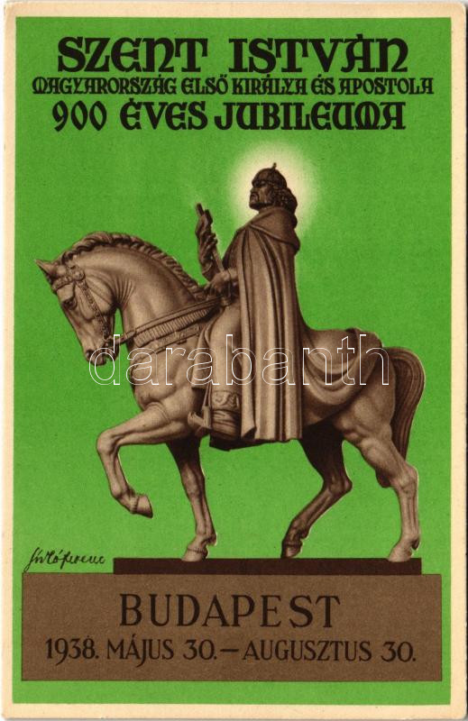 Description: 1938 Budapest XXXIV. Nemzetközi Eucharisztikus Kongresszus. Készüljünk a Magyar Kettős Szentévre! Szent István Magyarország első királya és apostola 900 éves jubileuma. Klösz György és Fia / Nonum centenarium s Stephani Regis Hungariae / 34th International Eucharistic Congress s: Fúró Ferenc
