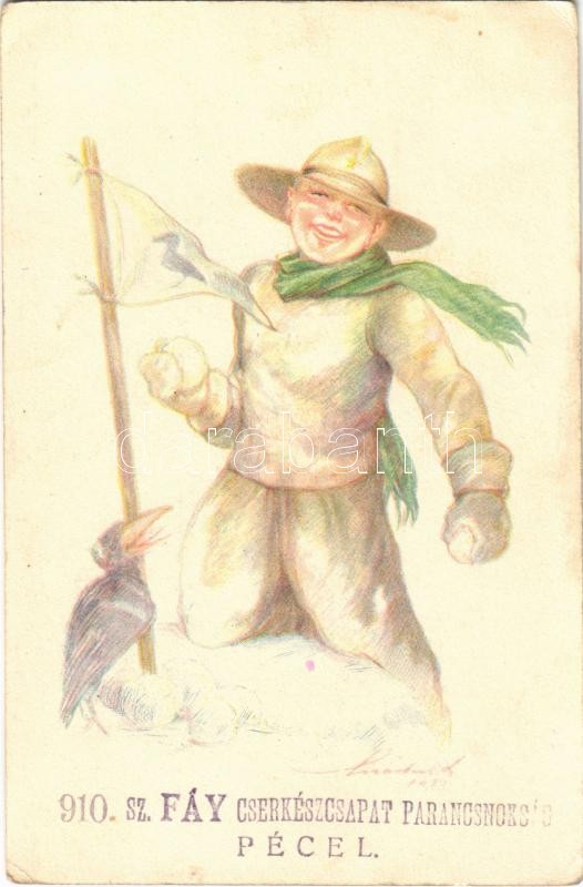 Description: 1932 A cserkész vidám. Kiadja a Magyar Cserkészszövetség / Hungarian boy scout art postcard, snowball s: Márton L. + "910. sz. FÁY Cserkészcsapat Parancsnokság Pécel" (EK)