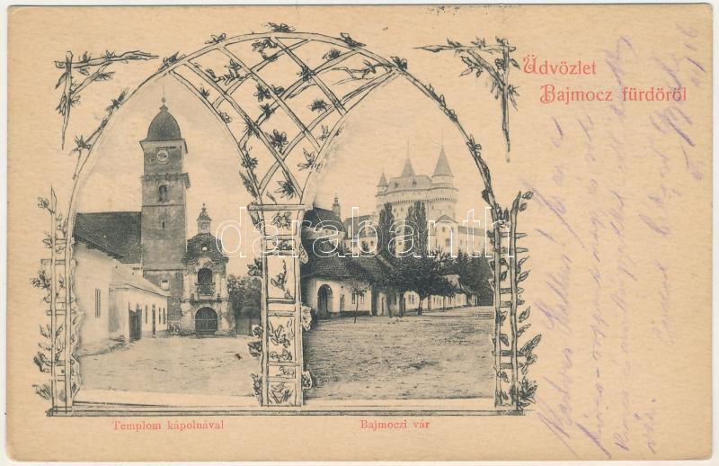 Description: 1899 (Vorläufer) Bajmócfürdő, Bojnické kúpele (Bajmóc, Bojnice); Templom kápolnával, Bajmóczi vár / church and chapel, castle. Art Nouveau + "NAGY-BÉLICZ - TÓT-MEGYER 71. SZ." vasúti mozgóposta bélyegző (EK)
